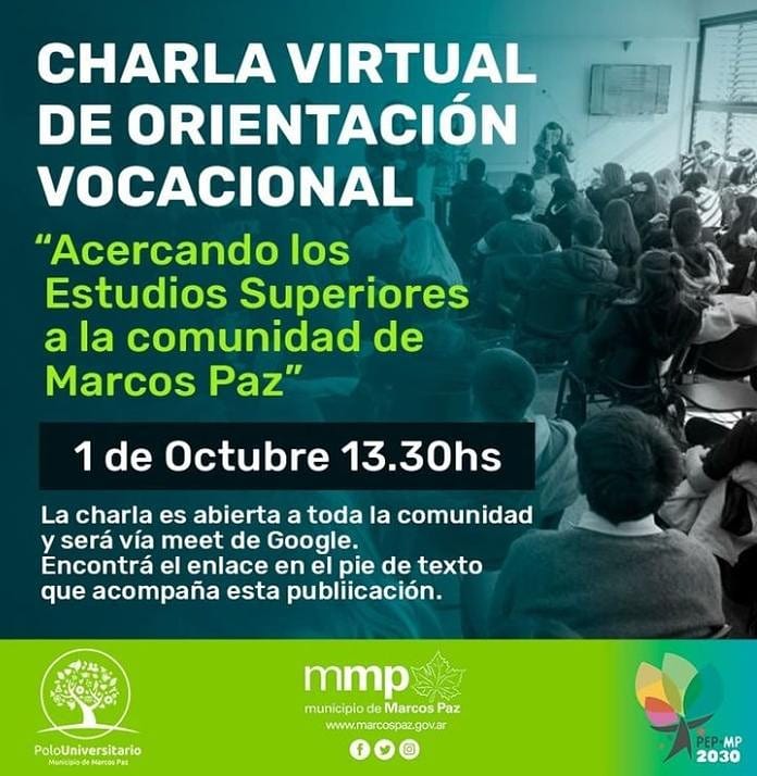 La charla ‘Acercando los estudios superiores a la comunidad de Marcos Paz’ tiene como fin guiar a la comunidad en la elección de carreras terciarias y universitarias. El link a la charla está publicado en el Facebook del Polo Universitario Marcos Paz.