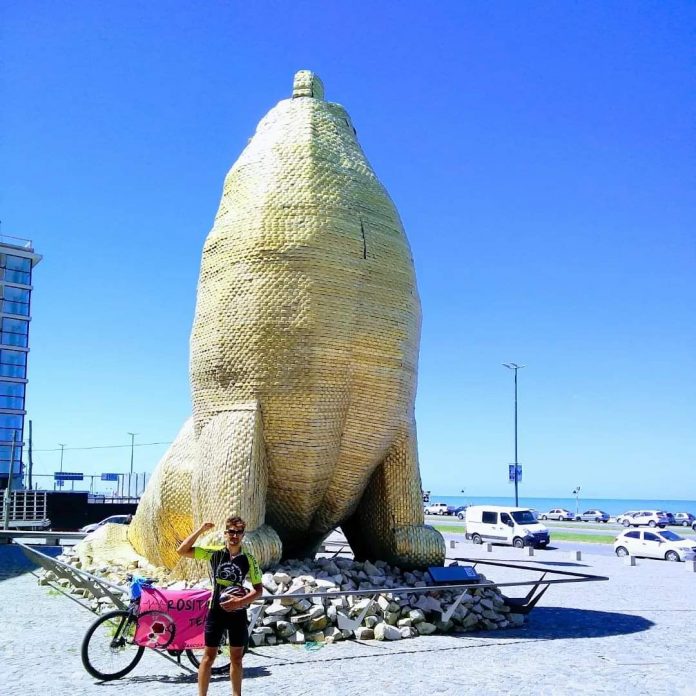 Con el clima muy cambiante, lluvia incluida, el ciclista del grupo local Rosita Team llegó a la ciudad balnearia y rápidamente se tomó unas fotos. En las imágenes podemos ver la muestra genuina de su felicidad, además de la bandera del equipo al que pertenece y la bandera nacional. «Por momentos se complicó por el clima y el cansancio, pero estoy muy feliz de haber alcanzado la meta y el sueño que me propuse», expresó en comunicación con el Sistema de Medios Públicos y concluyó: «Sé que todo valió la pena».