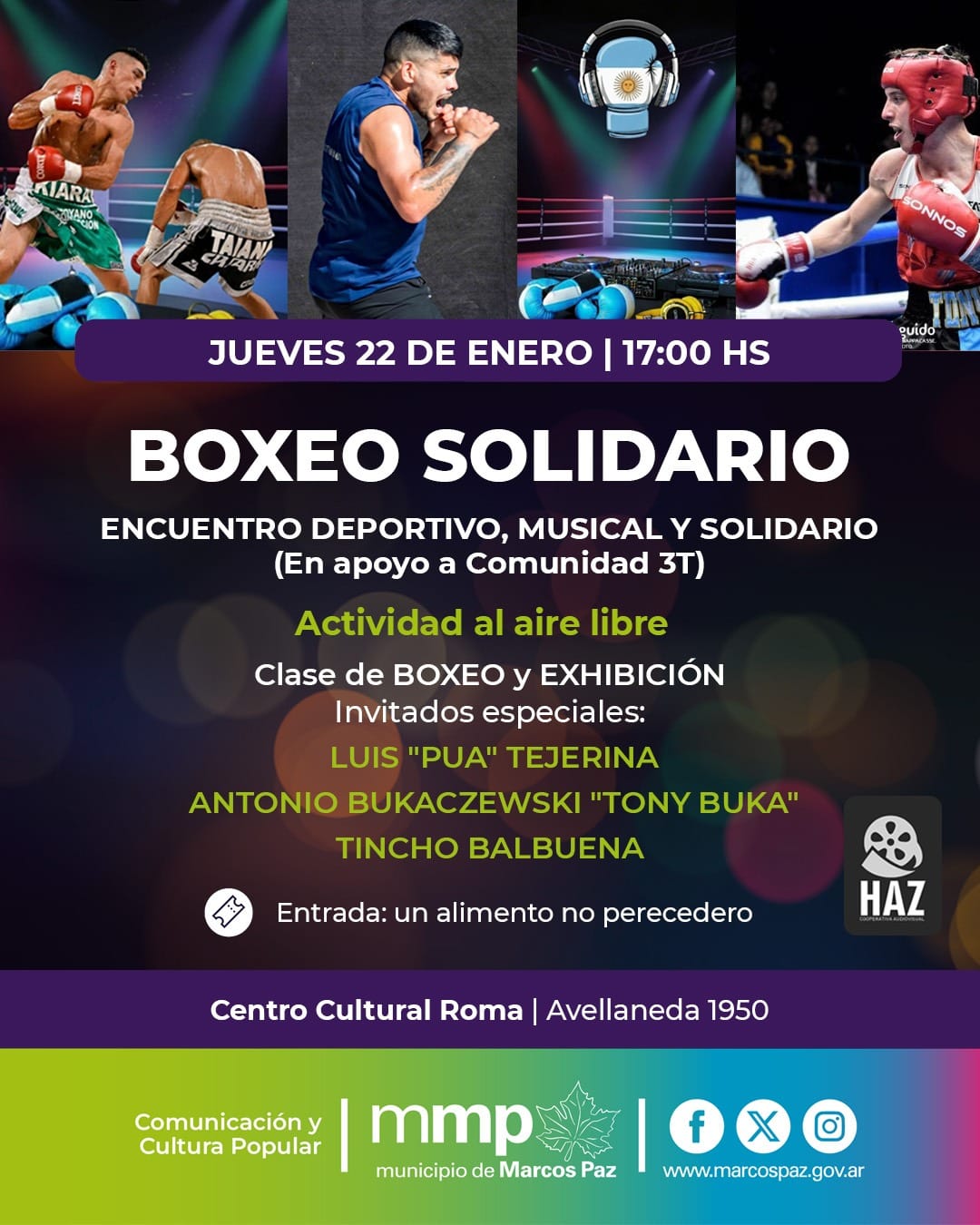 El jueves 22 de enero, desde las 17 hs, se realizará una Jornada de Boxeo Solidario en el Centro Cultural Roma, ubicado en Avellaneda 1950. El evento es organizado por Pablo Solé junto a un grupo de trabajadores ferroviarios y profesores de educación física y contará con clases abiertas de boxeo, exhibiciones, música en vivo y la participación de boxeadores amateurs y profesionales.