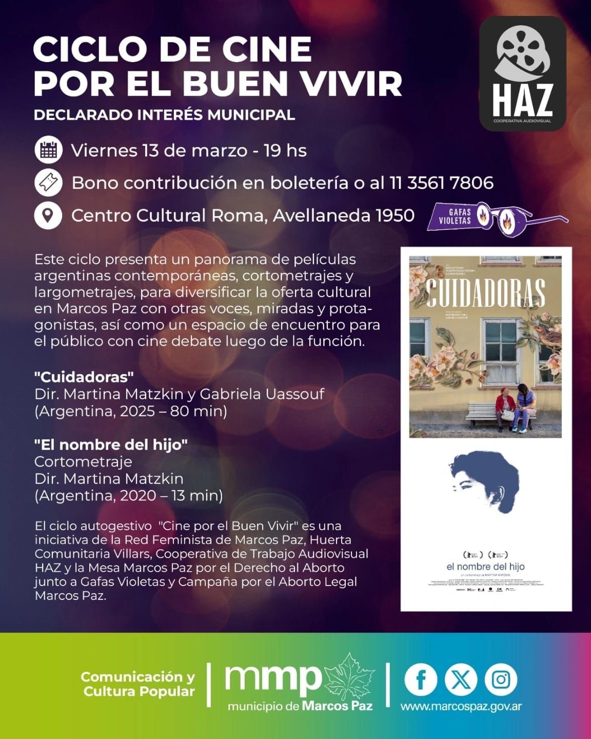 En comunicación con La Mañana Con Vos, Ángeles Anchou, referente del espacio ‘Gafas Violetas’, detalló que esta iniciativa es un logro de un amplio frente de organizaciones feministas locales. «Estamos muy contentas porque es un logro colectivo, pensamos juntas qué películas podemos ofrecer a toda la comunidad de Marcos Paz «, expresó Anchou. La jornada comenzará con la proyección del cortometraje de ficción ‘El Nombre del Hijo’ (2017), ganador del Teddy Award en el Festival de Berlín, que aborda la transición de un varón trans adolescente y su vínculo paterno. Posteriormente, se presentará el largometraje ‘Cuidadoras’, un film que retrata la relación entre adultos mayores y sus cuidadoras en un hogar público bonaerense. Ambas producciones pertenecen a la directora argentina Martina Matzkin, cuya obra es reconocida por su gran calidad cinematográfica y su enfoque en la diversidad.