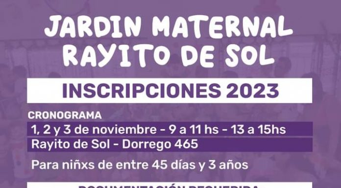 Esta mañana comenzó la inscripción al ciclo 2023 en el Jardín Maternal del barrio Rayito de Sol para niños y niñas entre 45 días de vida y 3 años. La documentación que hay que acercar son los originales y fotocopias del DNI del alumno y de los padres, de la partida de nacimiento y de la libreta sanitaria. La...